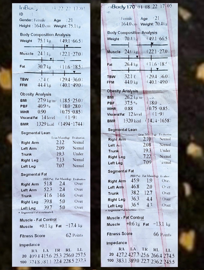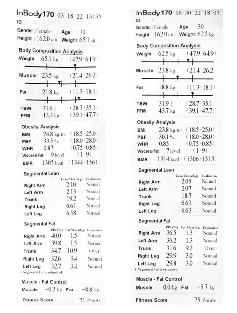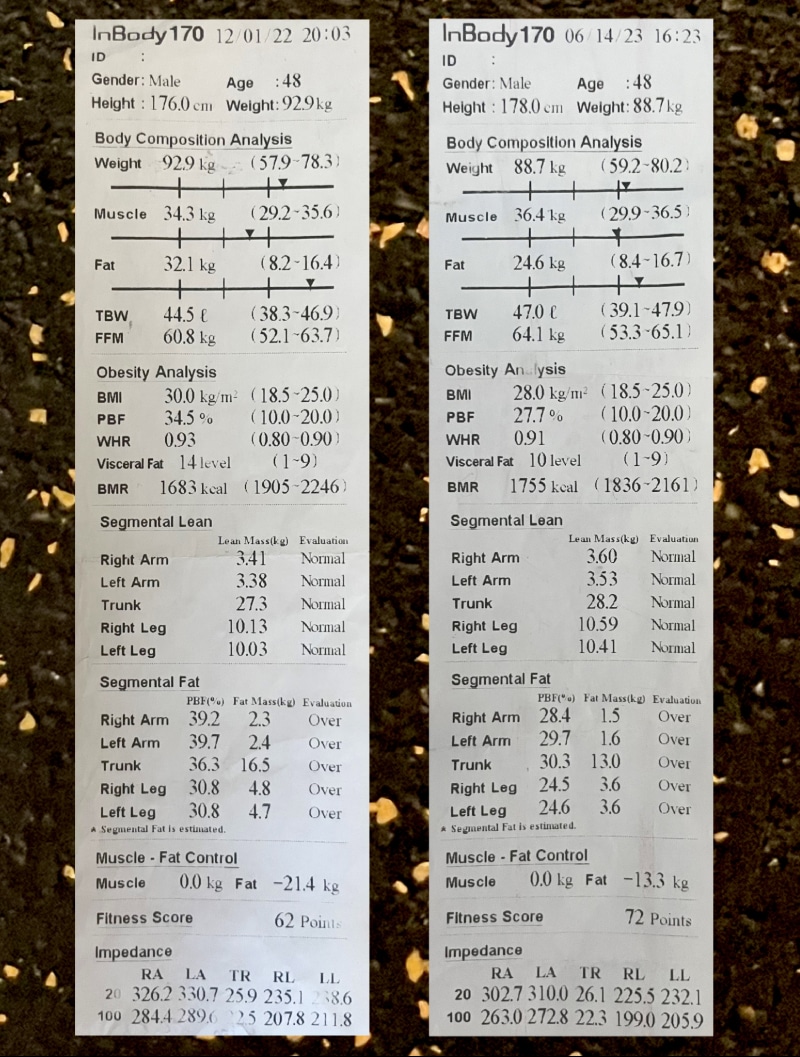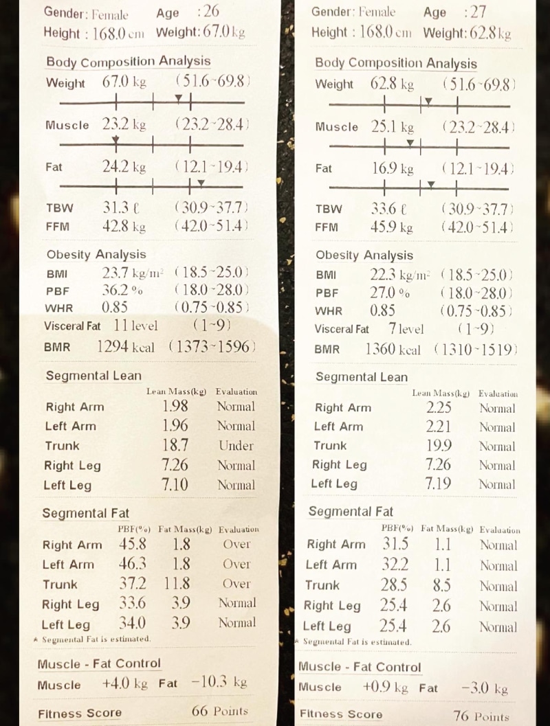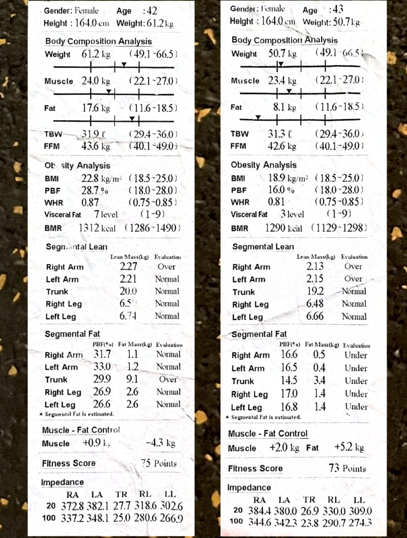 - -9,5 kg tkanki tłuszczowej (28,7% → 16%)