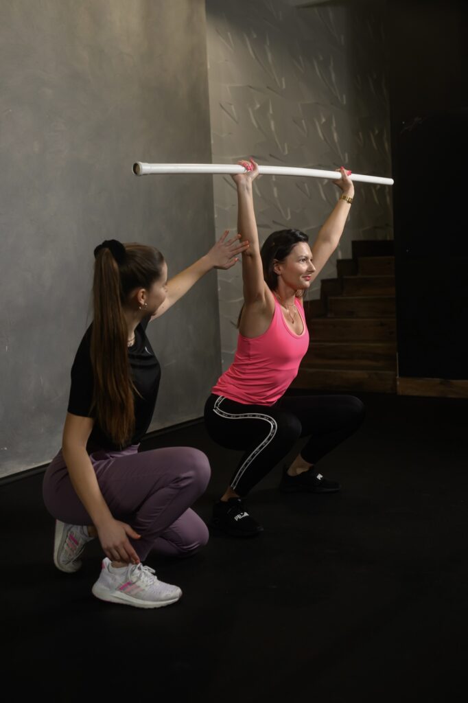 Ponadto praca z kijem przyłożonym z tyłu do ciała będzie bardzo dobrym pomysłem, ponieważ daje nam szybką informację zwrotną odnośnie tego, jak zachowuje się nasz kręgosłup. Kijek ma mieć 3 punkty styku z naszym ciałem: